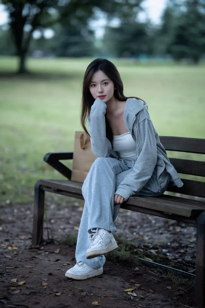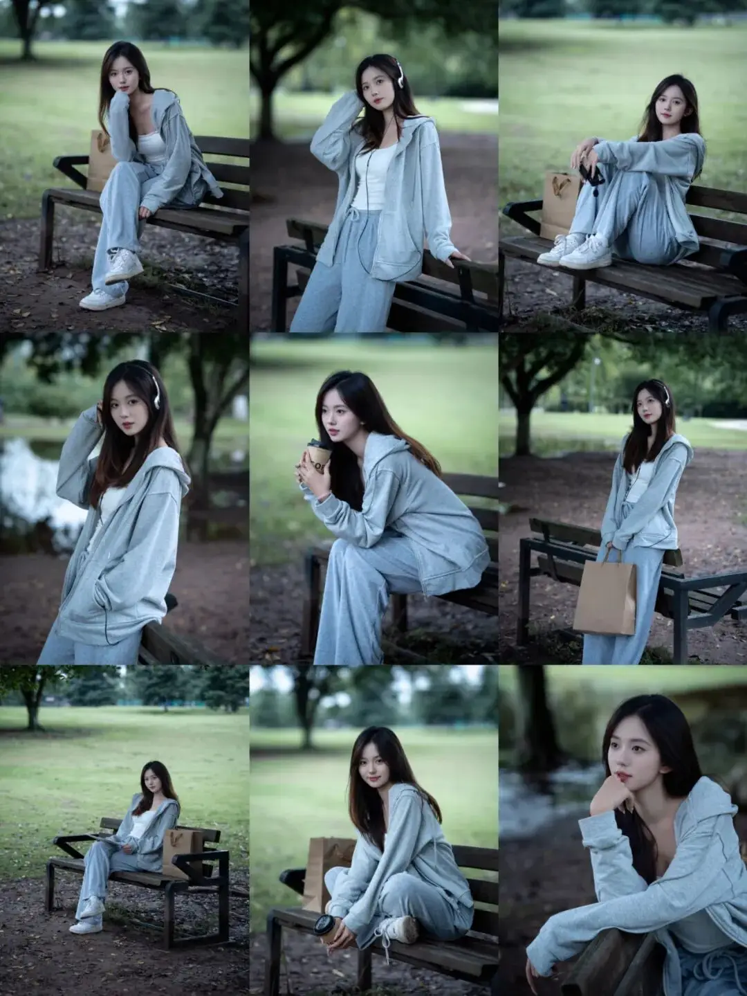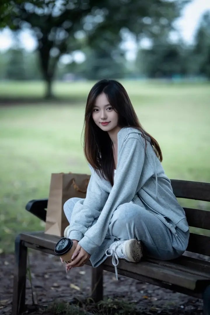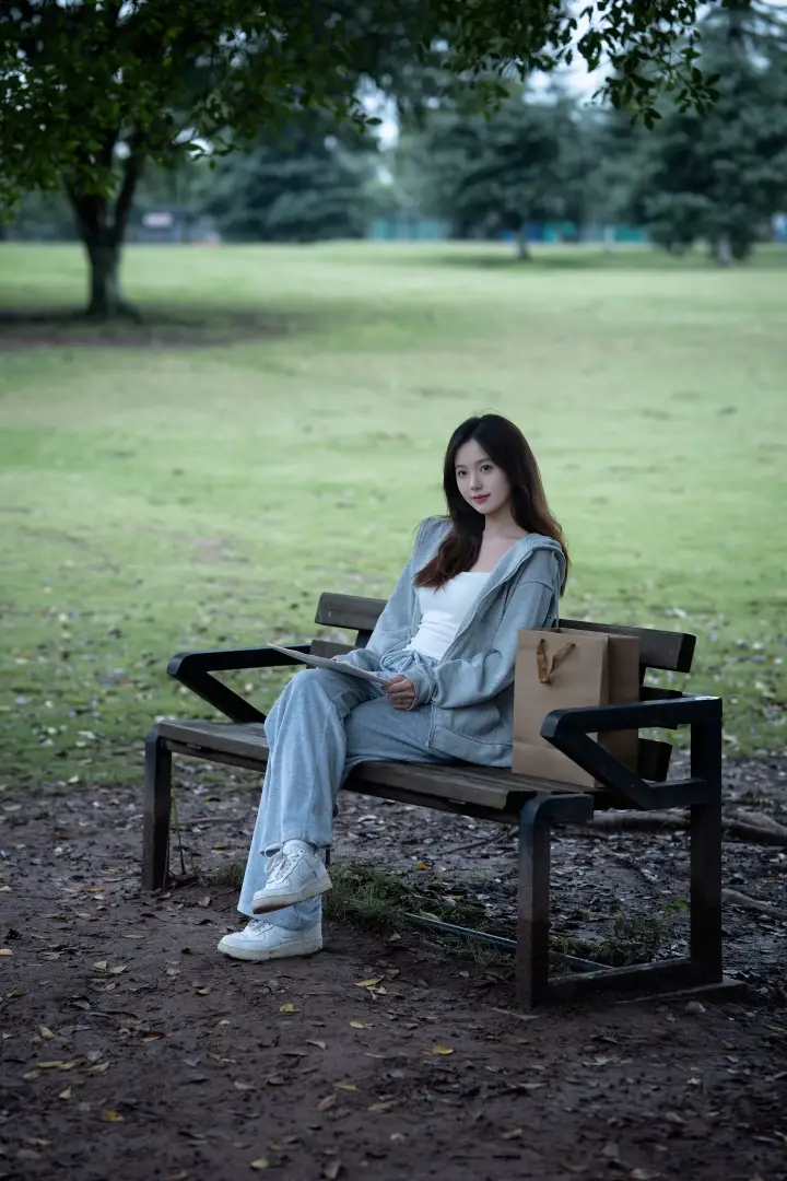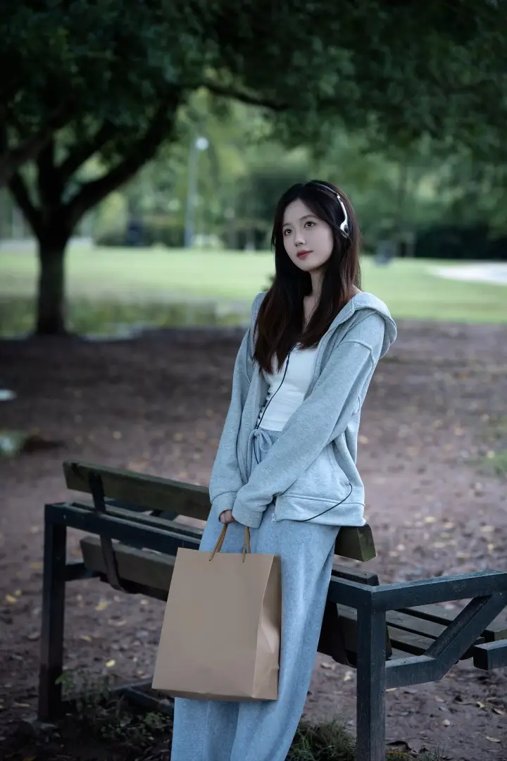 利用身边的小道具加分:身体侧靠在长椅末端,一手提着购物纸袋,戴上耳机,像是在公园歇脚的路人。道具的加入让画面更有故事感,眼神望向远方,这种不看镜头的抓拍,自带清冷疏离的都市氛围感。