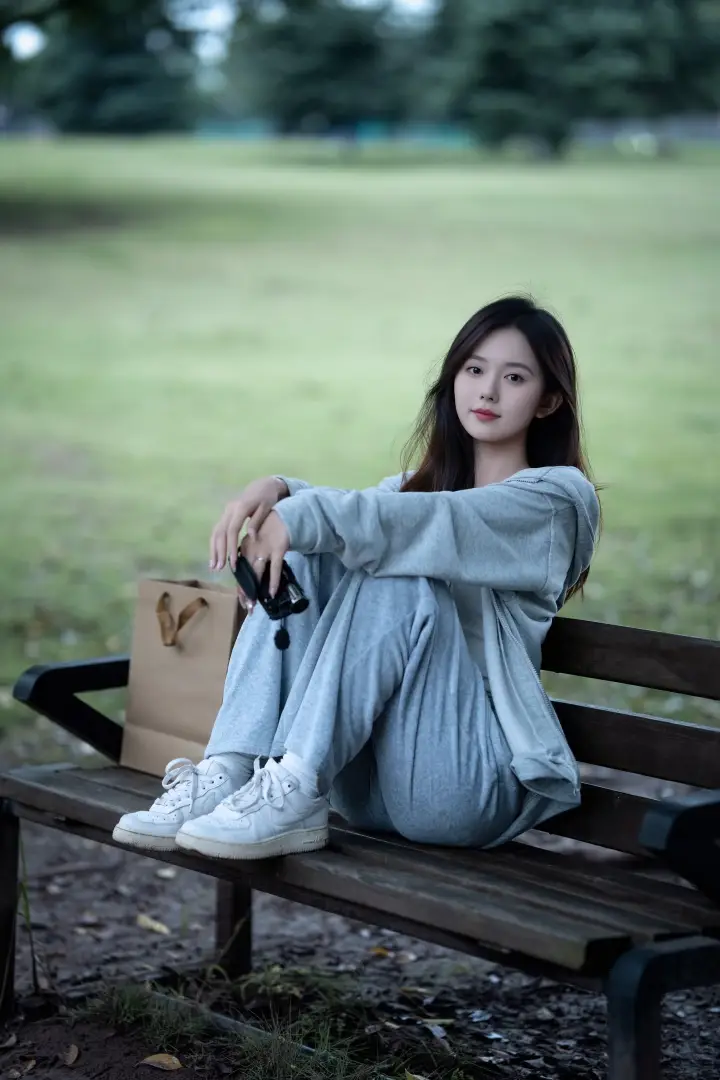 想拍出悠闲的生活感?那就坐得松弛些:舒服地坐在长椅上,一条腿翘起来踩在凳面,手里拿本书或平板。这个姿势充满了在公园享受慢时光的惬意感,慵懒中带着点知性美,特别自然。