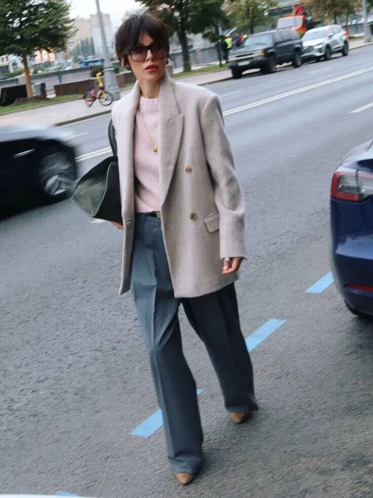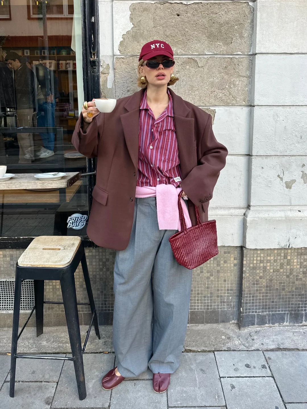 大面积中性色做背景板,小面积对比色造焦点:选亮眼内搭时,外套下装用黑白灰驼衬托;正红毛衣在黑外套包裹下,热烈纯粹被放大到极致;棕色夹克配粉色针织+白背心+粉包,色彩自然流淌显层次。足够呼吸空间,才能让主体更突出。
