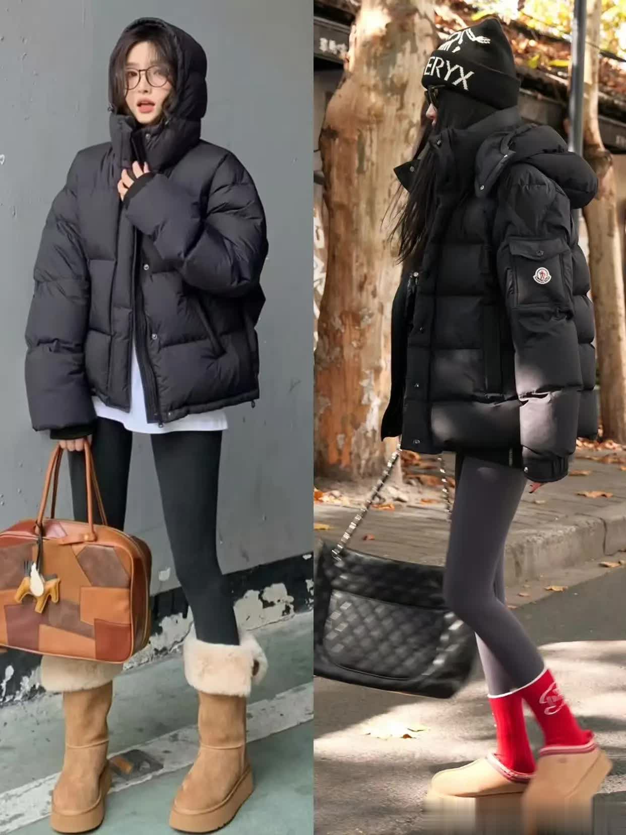 冬日穿搭中,上下装的搭配平衡很重要。宽松的羽绒服搭配紧身裤、小脚裤或无痕裤,形成松紧对比,**既能修饰身材比例,又能显高显腿长**,再配上短筒雪地靴,酷飒感十足。