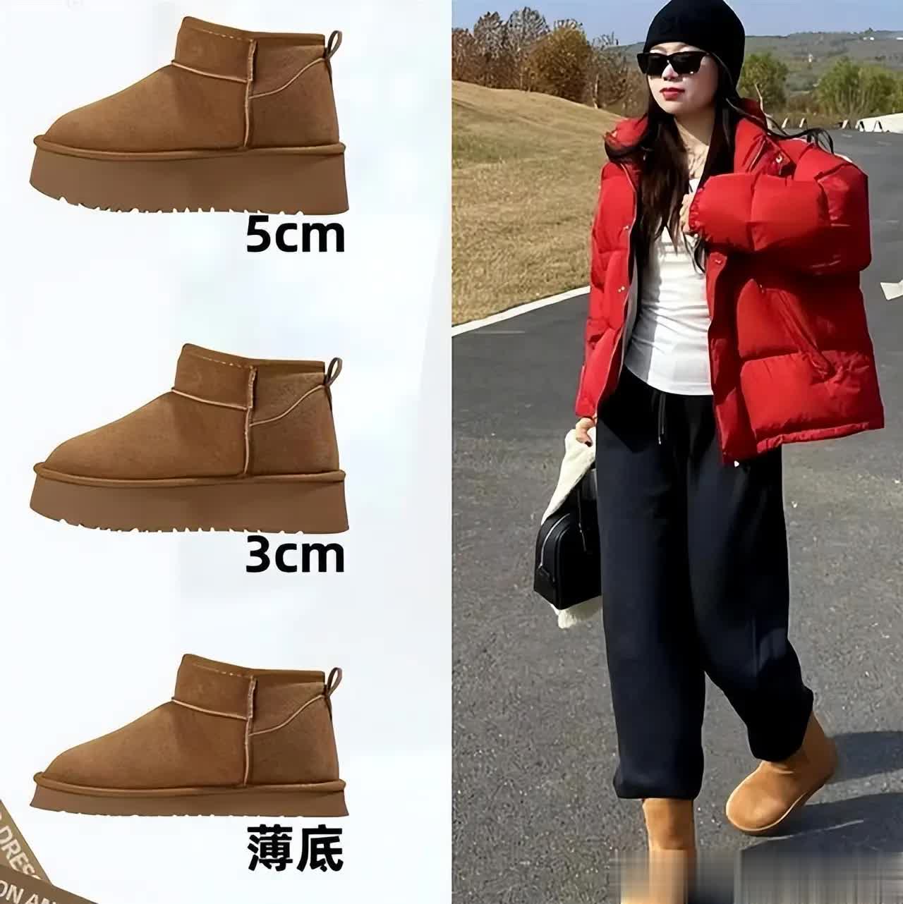 雪地靴的鞋底高度需适中:过高的鞋跟容易导致重心不稳,增加崴脚风险;过低的鞋底则缺乏立体感,显得整体造型平淡;**3-5cm的厚度既舒适安全,又能悄悄拉长腿部比例**,是理想之选。