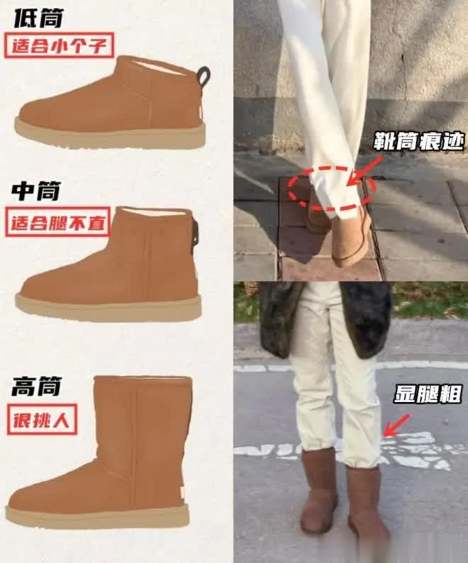 靴筒高度影响整体效果:长筒雪地靴容易暴露腿部粗壮的缺点,只适合腿型纤细的人群;低筒或中筒款式则能露出纤细脚踝,轻松打造显高效果,是大多数人的首选。