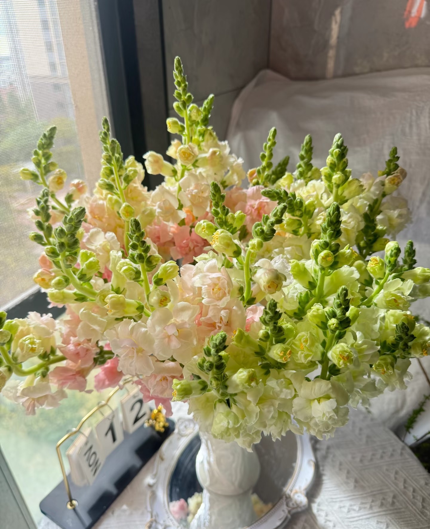 重瓣金鱼草是切花界的“佼佼者”,尽管只是很普通的草花,但在花店里身价不菲,它的花枝直立、花量巨大,一枝都是花苞,花朵不仅漂亮,还有香味,这些优点让它备受欢迎,在清水瓶中可观赏半个月左右。