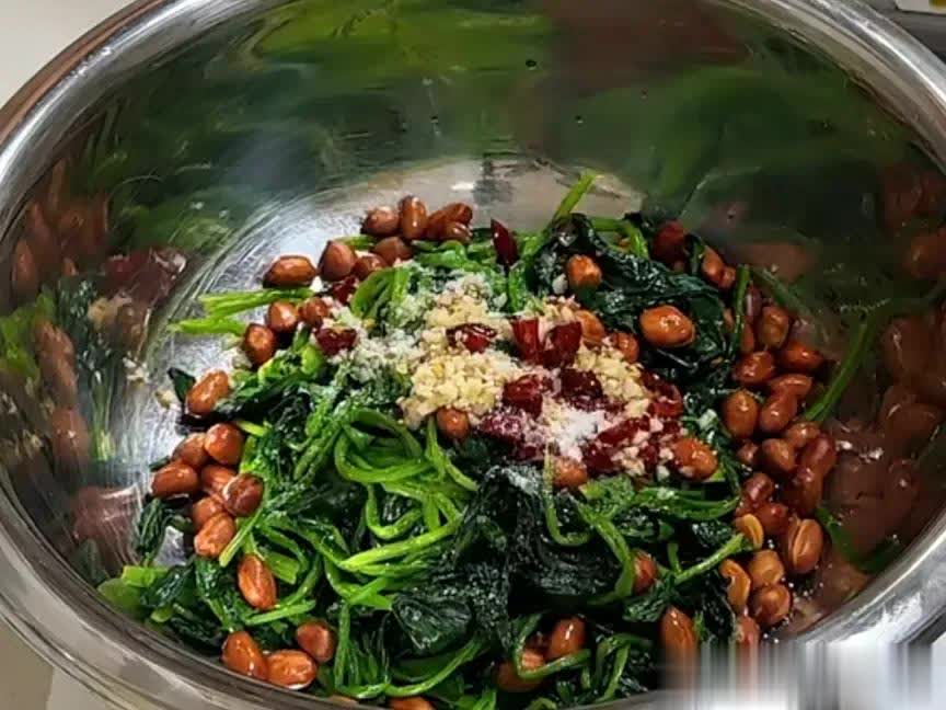 菠菜捞出来别直接拌,先挤干水分,挤到不滴水为止,这是入味的关键,不然水唧唧的挂不上调料,吃着寡淡无味。挤干水分的菠菜放进大碗里,加入蒜末,干辣椒段,泼一勺热油激发出香味,加半勺白糖,2勺生抽,1勺陈醋,1勺香油,少许盐和味精,喜欢吃花生米的,可以加一把花生米,这里的白糖千万别省,它不是为了甜,而是中和酸味,可以提升鲜味。