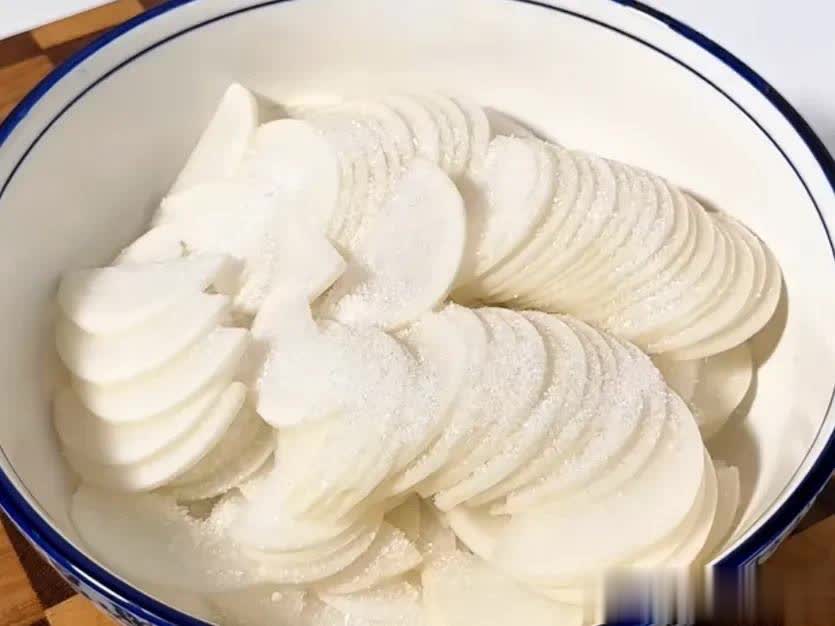 首先我们选择一个表皮光滑,拿在手里沉甸甸的大白萝卜,这种萝卜水分足,还不空心,腌出来脆度直接翻倍!一个萝卜大约2斤,洗净后不用削皮,带皮更脆爽,直接一分为二,切成薄片,切好装入容器中。重点来了,加入2勺白糖,下手抓拌均匀,这步加糖和加盐是一样的,都是为了杀出萝卜里面的水分,也可以去除萝卜里面的腥辣味,加糖的话不用洗,特别方便。抓到白糖融化,静置15分钟杀出水分!这步千万别省,不然腌出来的萝卜软塌塌的。