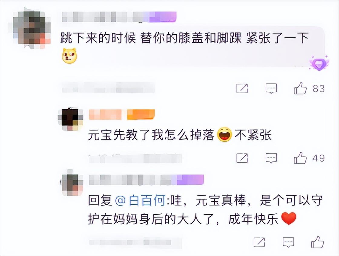 视频发布后,不少网友留意到攀岩运动存在的轻微风险,纷纷在评论区留言担忧:“跳下来的时候一定要注意保护膝盖和脚踝,别受伤了。”面对网友的关心,白百何暖心回复,透露背后的小细节:“元宝先教了我怎么掉落不紧张。”言语间不难看出,母子俩在体验运动前已有充分沟通,元宝早已主动承担起照顾母亲的责任,提前为母亲科普安全技巧。