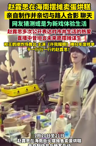 演员赵露思海南摆摊卖蛋烘糕,网友猜为新戏体验生活趣闻天下2026-01-23 15:0032124 近日,有网友偶遇赵露思在海南摆摊卖蛋烘糕,她亲自制作,还亲切与路人合影聊天,网友猜测其或是为新戏体验生活。 赵露思多次公开表达对市井生活的热爱,直播中曾坦言未来愿摆摊谋生。原文链接