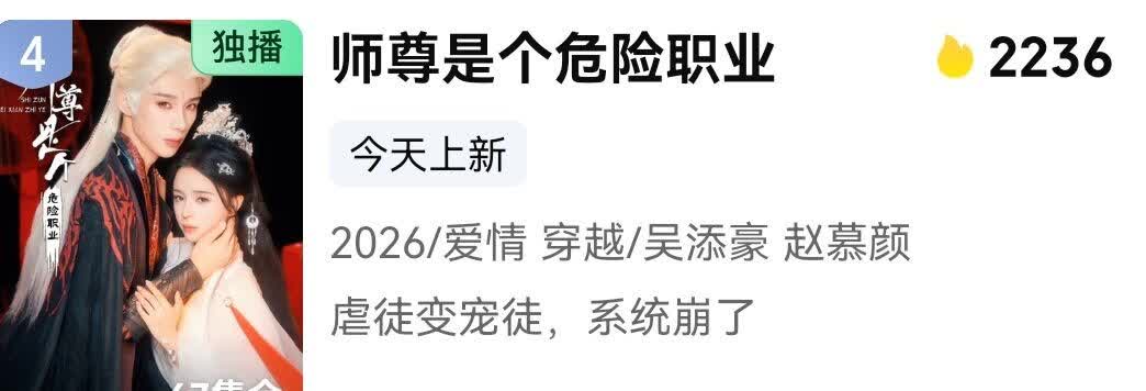 2月5日古装仙侠短剧《师尊是个危险职业》在爱奇艺开播,首日热度直接冲到2236,稳稳拿下爱奇艺短剧热播榜第四名,成绩相当能打!
