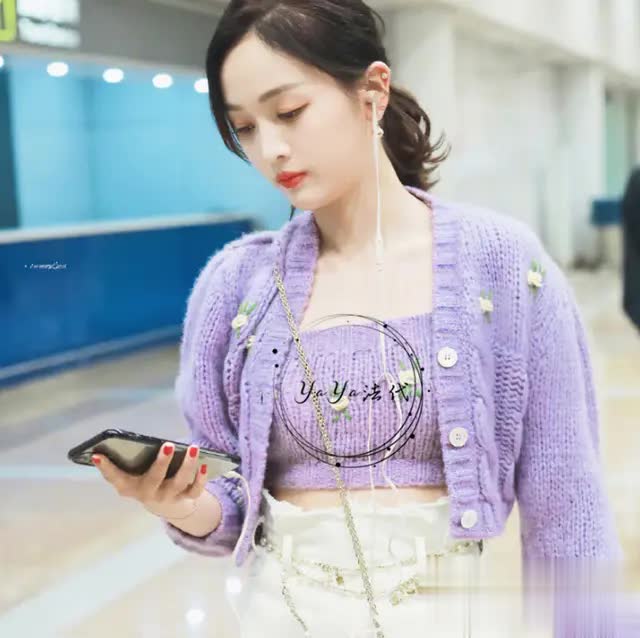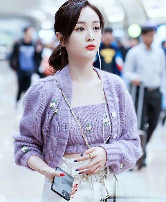 紫色是很有韵味的颜色,吴宣仪这件紫色针织衫,不仅颜色出挑,而且款式也很独特哦。短款的针织衫,提升了腰线,更显身材比例。