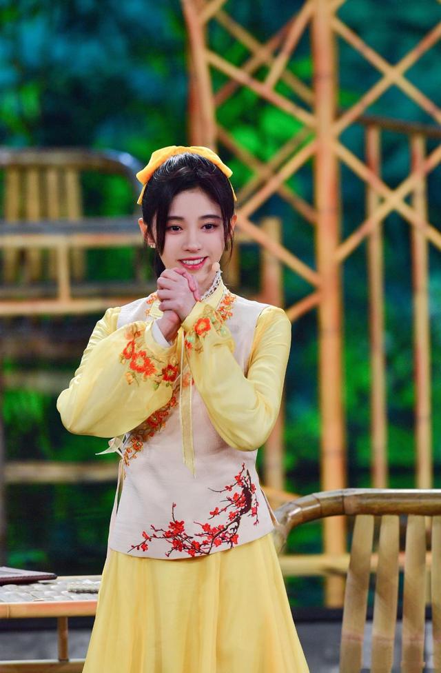 除了宫廷装,黄色的民族风鞠婧祎也手到擒来。如果光穿着黄色的绣花裙子,还真是有种从画中走出来的美人一般,肤如凝脂甜如蜜。但是加上了一朵黄色的蝴蝶结之后,就将卡哇伊的元素和国风氛围完美的结合在了一起,生动又迷人。