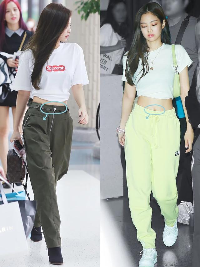 同为小个子的Jennie也是酷爱这种穿法,随便一个T恤配上工装裤,都是普通的不能再普通的搭配,但是加上了一点别出心裁的露肤,整体就染上一抹飒爽帅气的格调。这里就比较需要注意一下了,一般情况下是裤子越高越显腿长,所以一般腰围都要在肚脐的上下,或者是直接过了肚脐。