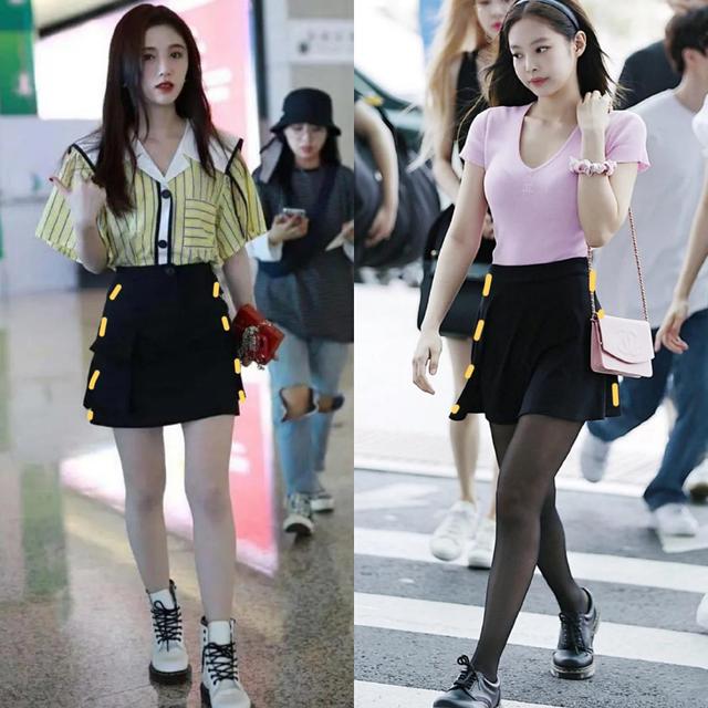 再看Jennie同样是对A字裙爱不释手,粉色的小V领上衣+黑色半裙,端庄淑女还带着点少女的纯真与灵动,下面利用黑色的长筒袜和马丁靴来增加一丝性感诱惑的欧美范。保持着自身猫系慵懒的气质,也同样兼顾着女性的魅惑力。