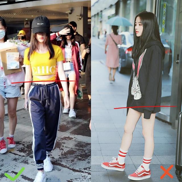 两张都是鞠婧祎的搭配,但是可以明显的看出来衣品好的重要性。左边:短款上衣+高腰的运动裤,下面配上白色的运动鞋,休闲随性又有少女感。腿部的比例也被明显的拉长,根本不像是159cm的样子。