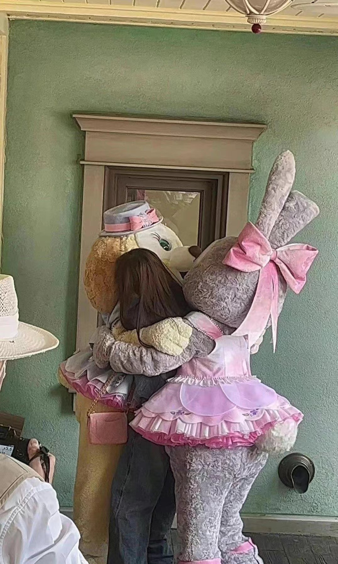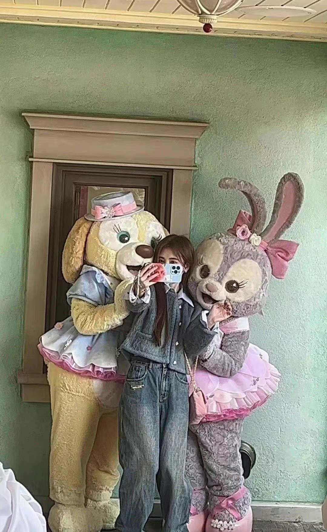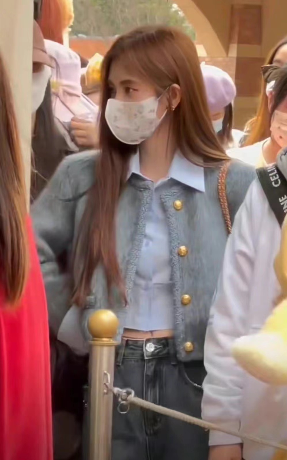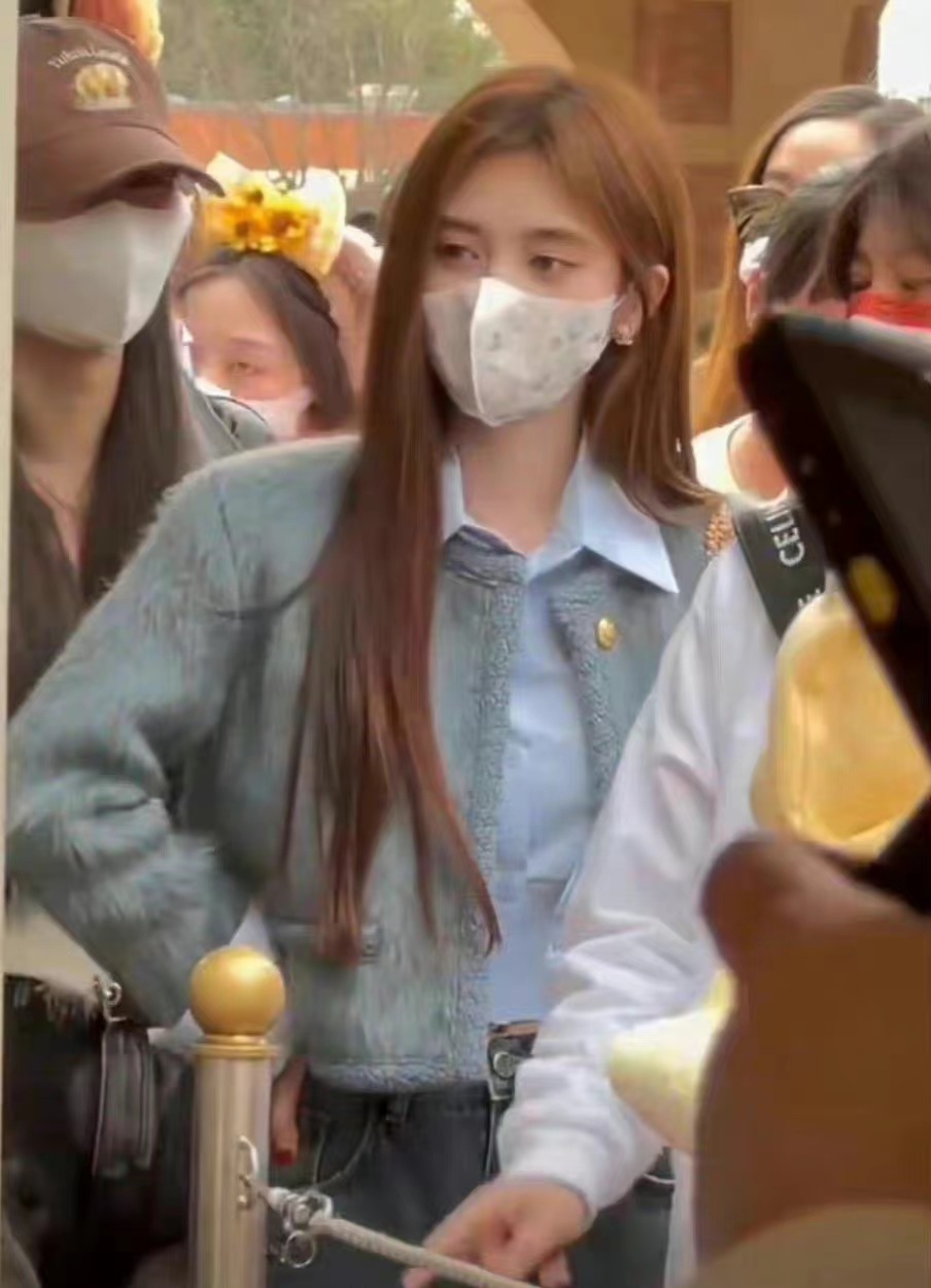 鞠婧祎游迪士尼穿蓝貂绒小香风外套配牛仔裤,休闲时尚