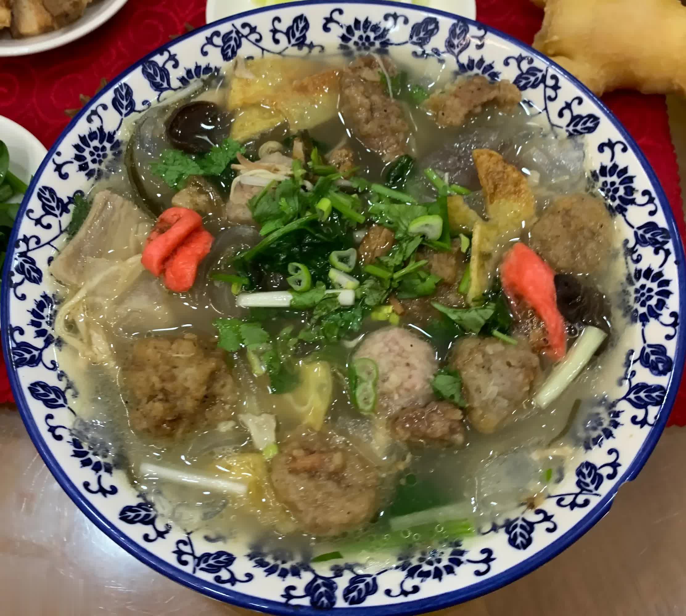 这道硬核小吃是榆林人的待客底气,食材实在到满碗堆尖。土猪肉剁丸炸至金黄再慢炖,横山羊肉、农村笨鸡熬成奶白浓汤,加土豆、黄河水老豆腐、黄花菜同烩,荤素比例精准拿捏。丸子外韧里嫩、咬开爆汁,酥肉吸足鲜汤仍留脆感,粉条裹满肉香滑爽入味。老榆林人吃时必加一份粉条,吸尽汤底精华,一碗下肚,暖意从喉头渗到四肢,藏着黄土高原的饮食智慧。
