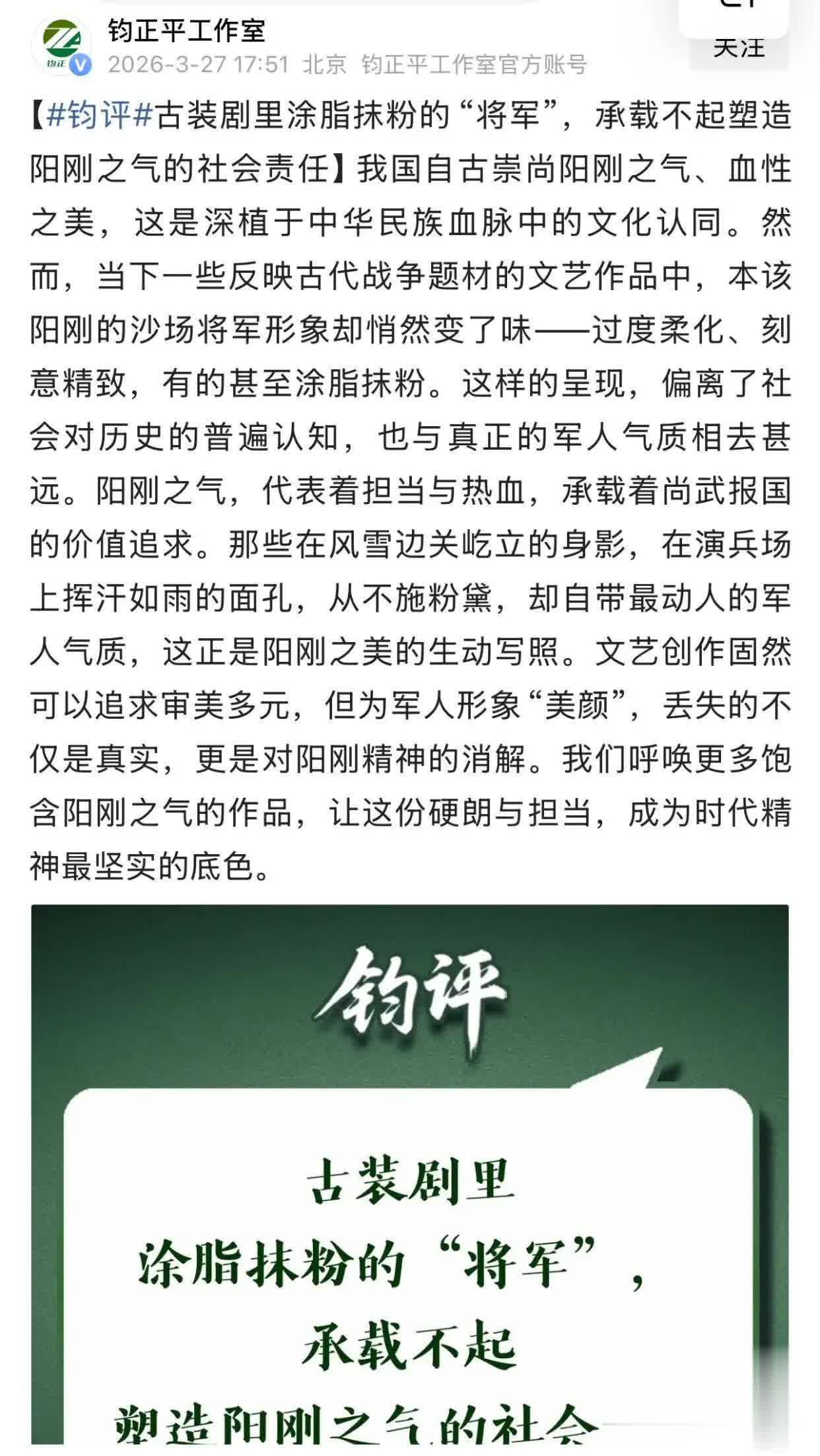 2026年3月,《逐玉》里“武安侯谢征”亮相,意外引发了一场席卷全网的文化震动。这个身着华丽战甲、肌肤宛如凝脂的“粉底液将军”,在钧正平定下“承载不起塑造阳刚之气的社会责任”基调后,迅速成为剖析当代审美困境的一个符号。这场看似单纯的妆容争议,实际上撕开了影视工业、饭圈文化以及民族精神认同之间的多重裂缝。
