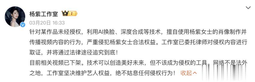 就在今年3月20日,迪丽热巴案件通报的同一天,另一位顶流女星杨紫的工作室也发布了强硬声明。声明直指某作品未经授权,利用AI换脸、深度合成等技术,擅自使用杨紫的肖像制作并传播视频内容,严重侵犯了其合法权益。