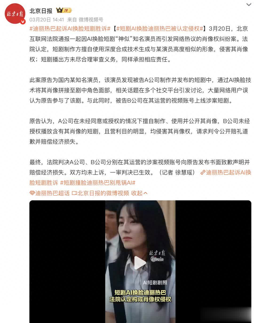 3月20日,国内顶流女星迪丽热巴(原告)将两家微短剧公司告上了法庭。原因令人咋舌:在一部名为《逆骑》(44集、约90分钟)的微短剧中,女主角的脸竟然被AI技术“无缝替换”成了迪丽热巴的模样。这部剧在多个社交平台和视频账号上大肆传播,无数不明真相的粉丝和路人还以为这位一线大咖不顾《白日提灯》的宣传,“自降身价”去拍了土味微短剧。
