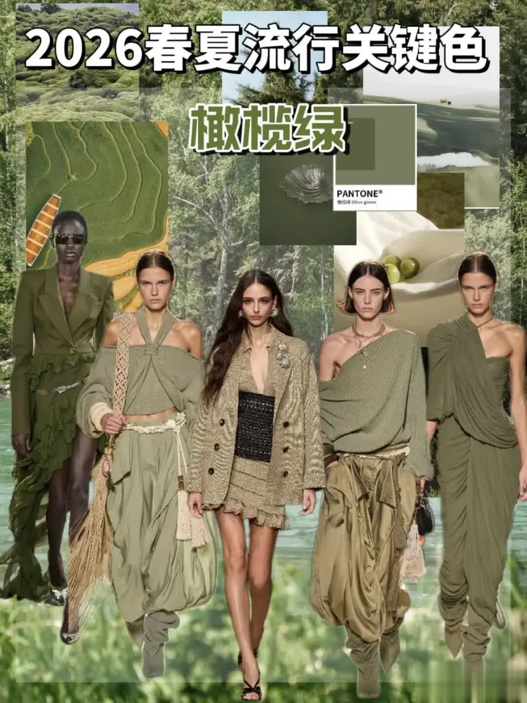 橄榄绿介于绿色和棕色之间,带有一种自然、朴实的质感,不仅能够与春夏天的自然环境相呼应,还能很好地衬托出经过洗礼后的健康肤色。