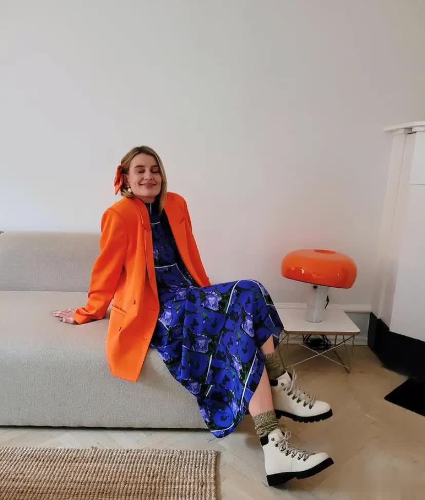 亮橘色西装,搭配宝蓝长裙,一冷一暖的互补,不仅让色块的组合很吸睛,还有艺术感的味道,是艾利极力推荐的配色方式。
