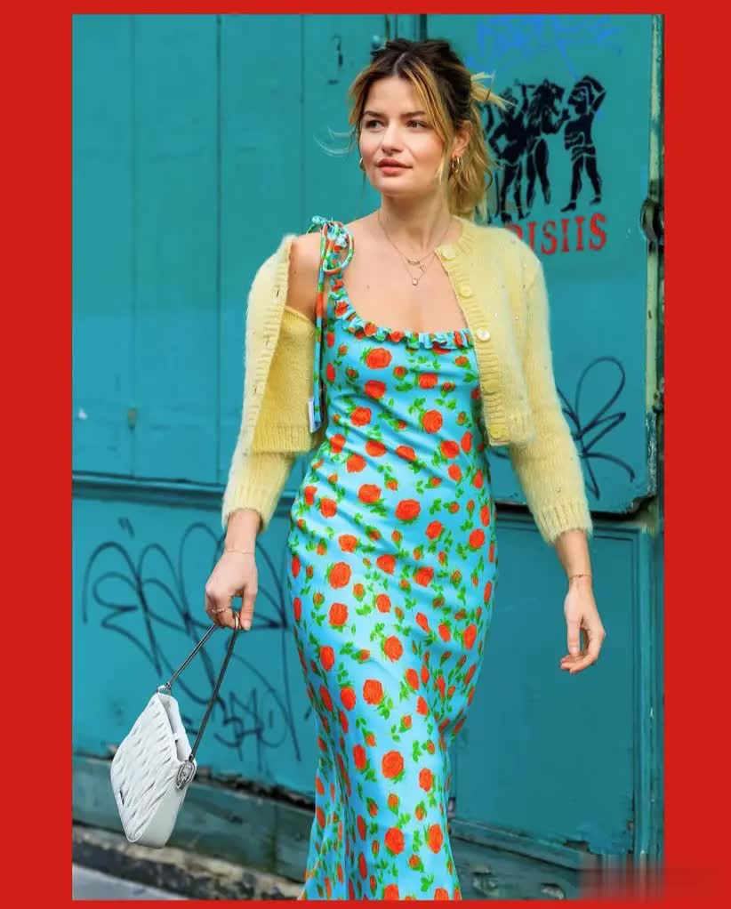 法国时尚记者Sabina的这件小裙,则是将波点图案做出了一些变化,花朵图案的红,与湖蓝裙子碰撞出可爱的图案。她还选了一件米黄小衫搭配,清新而明媚的色彩,再次印证法式田园感的时髦味道。