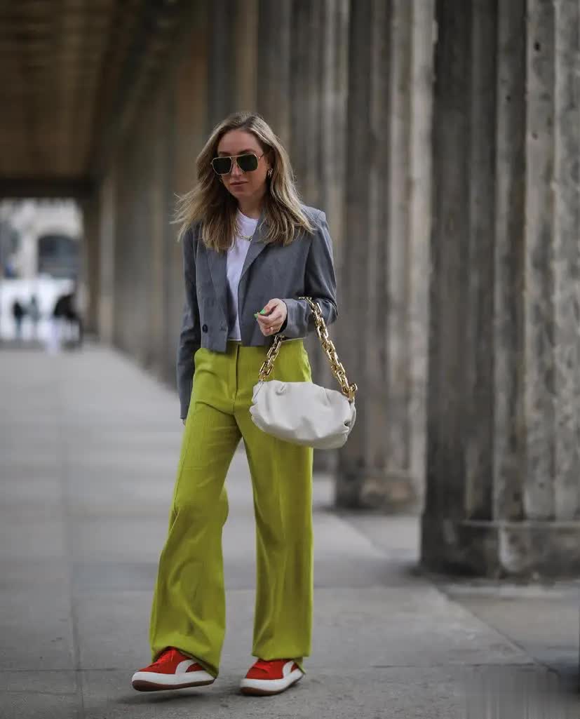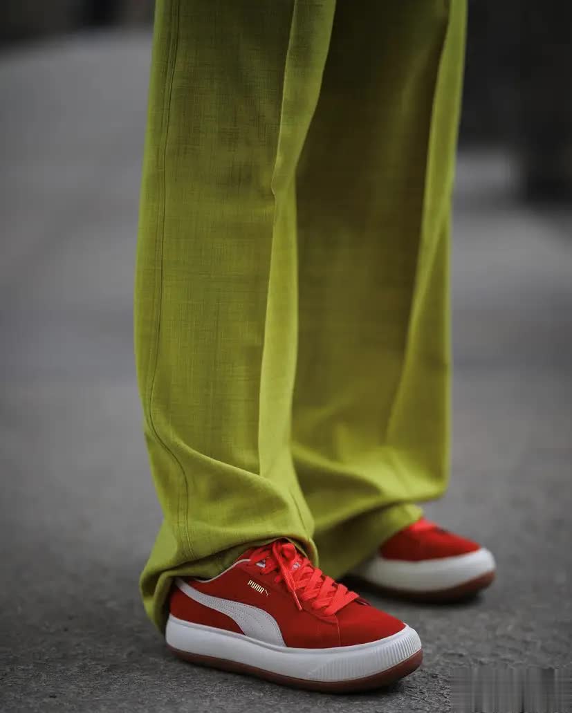 偶尔看似矛盾的撞色,也能带来很别致的配色,芥末绿的飘逸长裤,不妨用大红运动鞋碰撞一下,因为色彩面积不大,所以也不会显得很突兀,反而多出个性感。