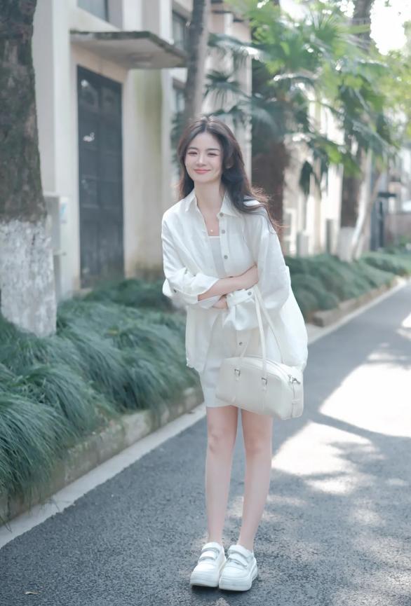 若是日常逛街,想要拍照更出片,建议选择“薄一点”的雪纺衬衫。纽扣全部解开穿,袖子卷起来,内搭一件同色的修身吊带,若隐若现的露出身材轮廓,保证可以让你美成人群当中的焦点。
