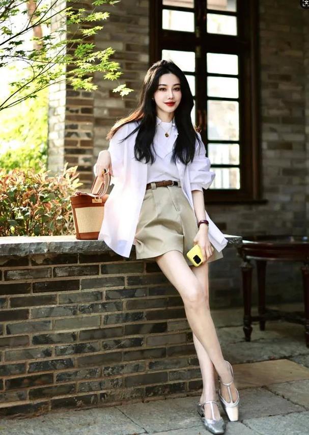 衬衫版型上带点“松弛感”,才能够弱化职场属性,搭配起来的时候,还需要增加“露肤度”。下身直接搭配一条阔腿短裤,既显身材又很有女人味,更具备春日法式氛围感。