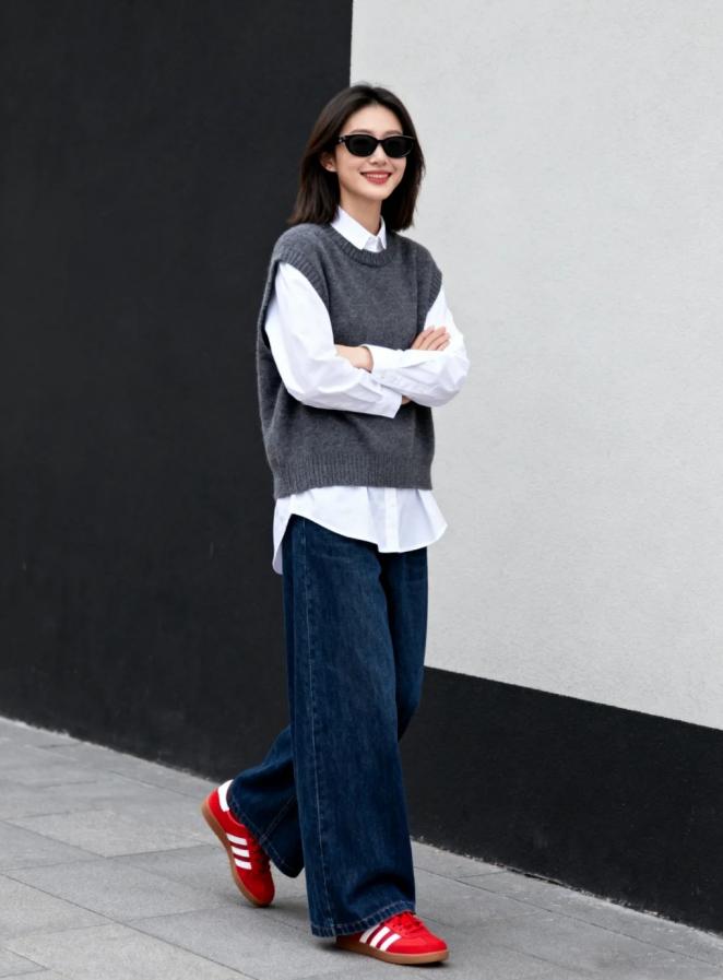 衬衫想要穿的高级好看,还得靠“叠穿”。最基础的两件叠穿,穿衣小白也能轻松尝试。把白衬衫当成内搭穿,套上一件灰色针织马甲,上半身会更有层次感。