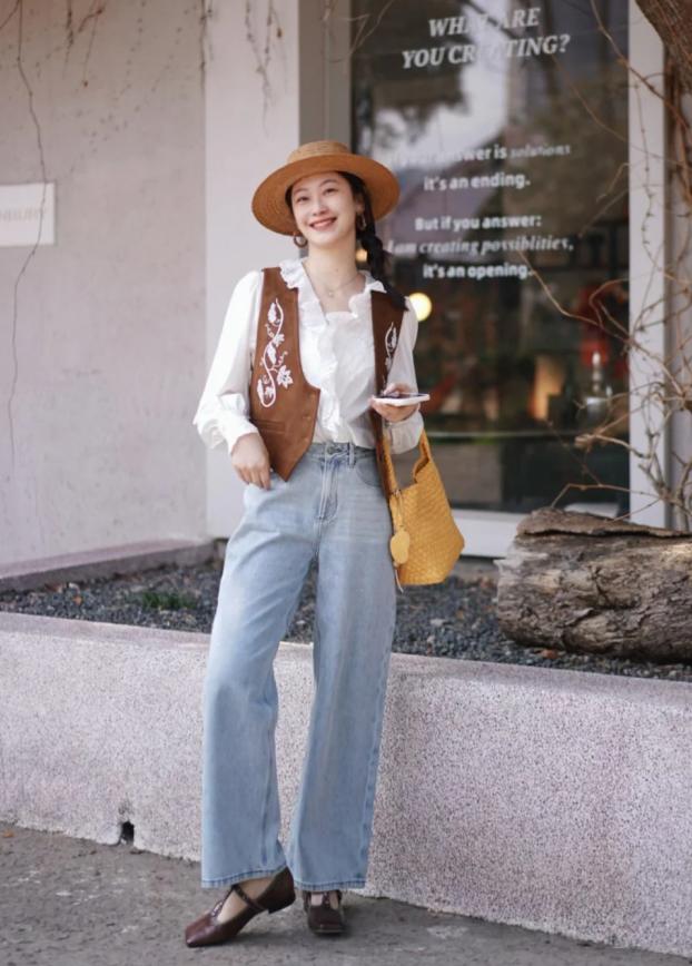 偶尔试试混搭,会给你带来想不到的惊喜。木耳边样式的白衬衫,自带活泼的感觉,衣领露出锁骨更显得身材比较苗条,叠穿刺绣马甲,戴上草编帽子还有加上吊坠耳环,这么穿出去回头率能到百分百。