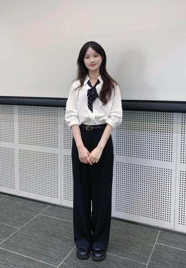 春天穿白色衬衫的时候,要记住比例的重要性,尽量别穿oversize版型的,选微宽松的款式,这样藏肉比较容易搭配,而且把下摆塞进裙腰的时候,腰腹部不会鼓起来,显瘦还显得腿长。