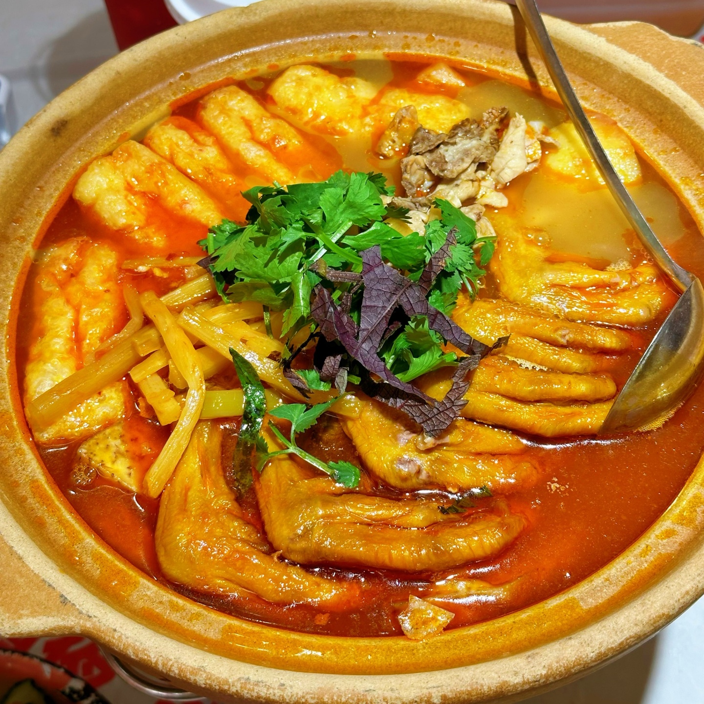 这可是2024年入选“桂菜十大名菜”的硬菜。一锅上桌,红油汤底里沉着炸过的带皮鸭脚、田螺、芋头、豆腐泡。鸭脚炖得皮软肉烂,轻轻一吮便骨肉分离;芋头吸饱了汤汁,绵密中透着鲜辣;豆腐泡更是精华所在,一口咬下去,汤汁在嘴里四溢开来。三五好友围坐,边吃边聊,一锅鸭脚煲能从黄昏吃到深夜。