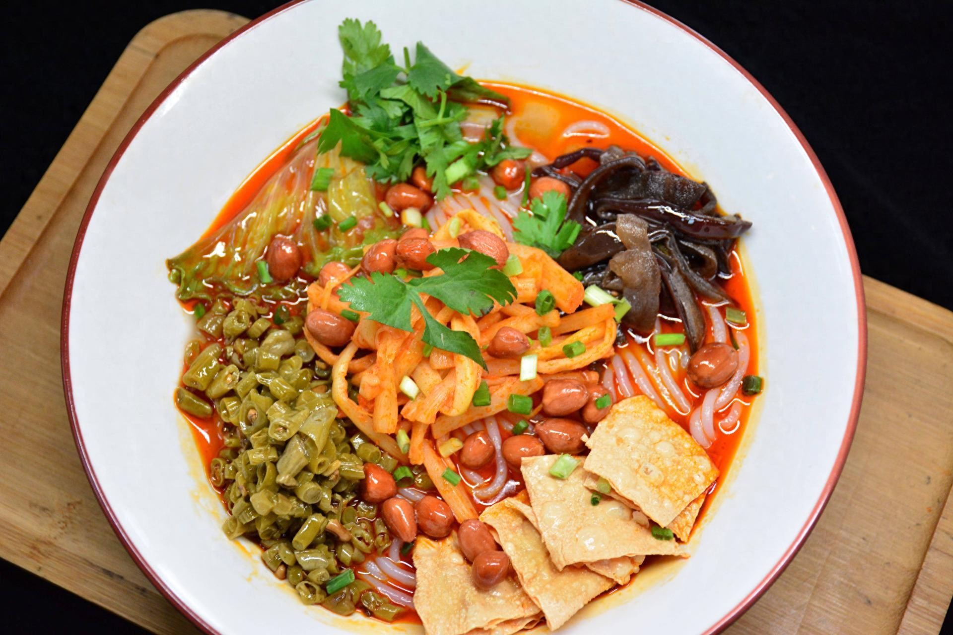 柳州的牛杂火锅分汤锅和凉拌两种。汤锅酸辣开胃,牛百叶、牛喉管、月亮肉、吊龙边这些下水,在翻滚的汤里烫过之后,脆嫩爽口。凉拌牛杂则是夏日首选,牛杂煮熟后拌上特制酱料,配上花生、香菜,清爽鲜美,和面条拌在一起吃更是一绝。牛杂火锅的灵魂在于用柳州特色糟辣酱制作的蘸碟,酸酸辣辣十分过瘾。