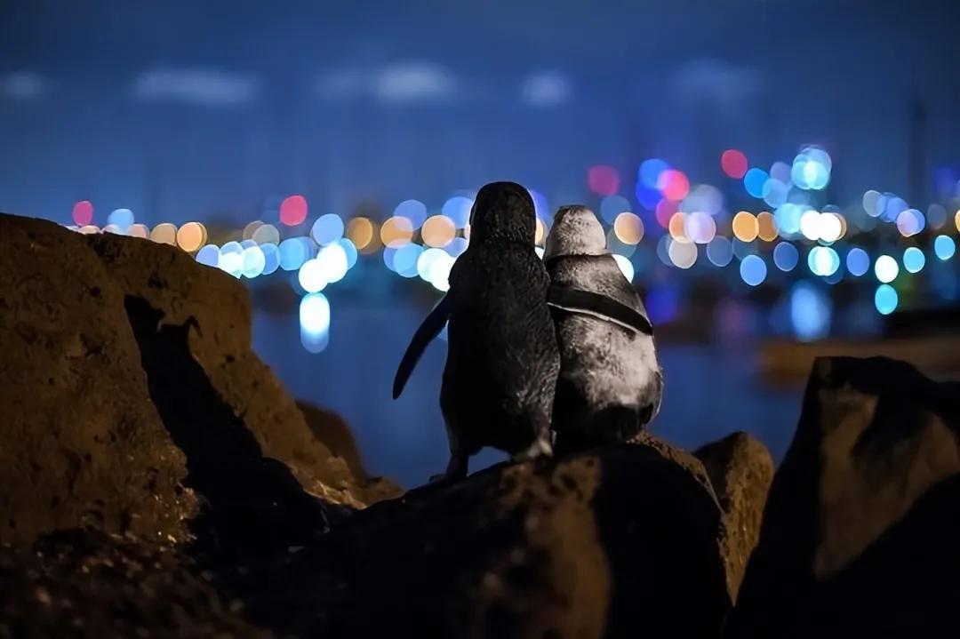 第10张可能是最温暖的一张。澳大利亚圣基尔达码头,两只小蓝企鹅依偎着站在岩石上,凝视着远处墨尔本的城市灯火。摄影师Tobias Baumgaertner原本想拍人类发展对野生动物的压力,却意外捕捉到了 “陪伴和爱”。他等了三个晚上,才等到企鹅们上岸,这两只恰好是最亲密的一对。“它们在互相安慰,”他说,“这画面胜过千言万语。”