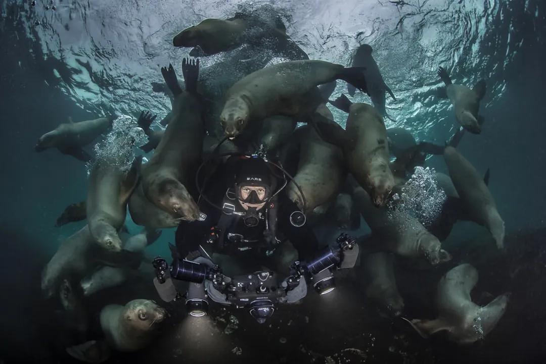 2021 年度冒险摄影师决赛入围者地点:加拿大描述:海狮群围绕潜水员。摄影师史蒂夫·伍兹说:“海狮在不列颠哥伦比亚省已经周期性被扑杀超过一个世纪,现在有人推动捕杀2.5万只。”“在水下拍摄它们时,完全不使用诱饵或食物,它们只是想玩耍和互动。我从未在世界其他地方见过这种独特的行为,这让它们面临被扑杀的威胁更加令人心碎。”