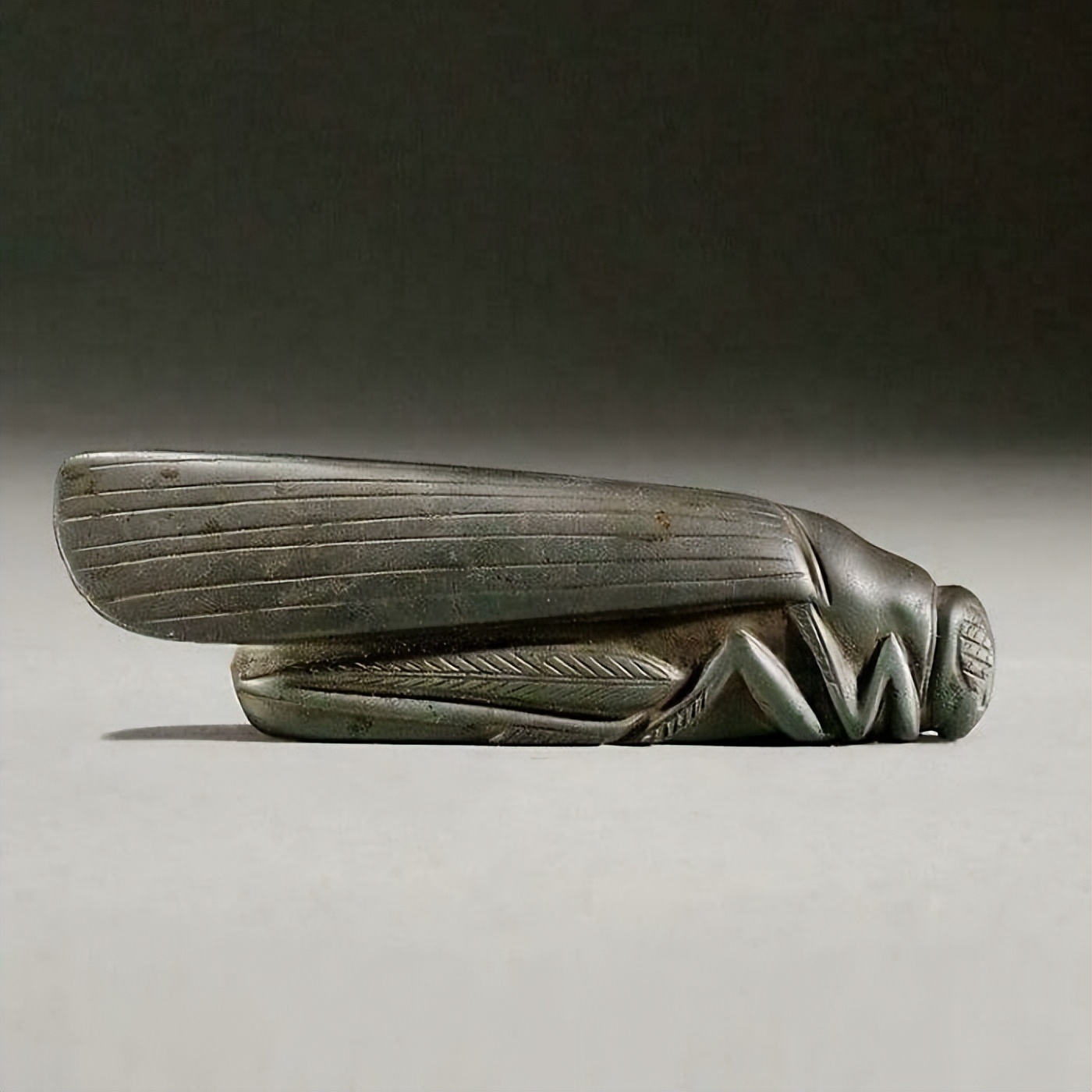一只用黑色矿石雕刻的蚱蜢,栩栩如生,纹理清晰