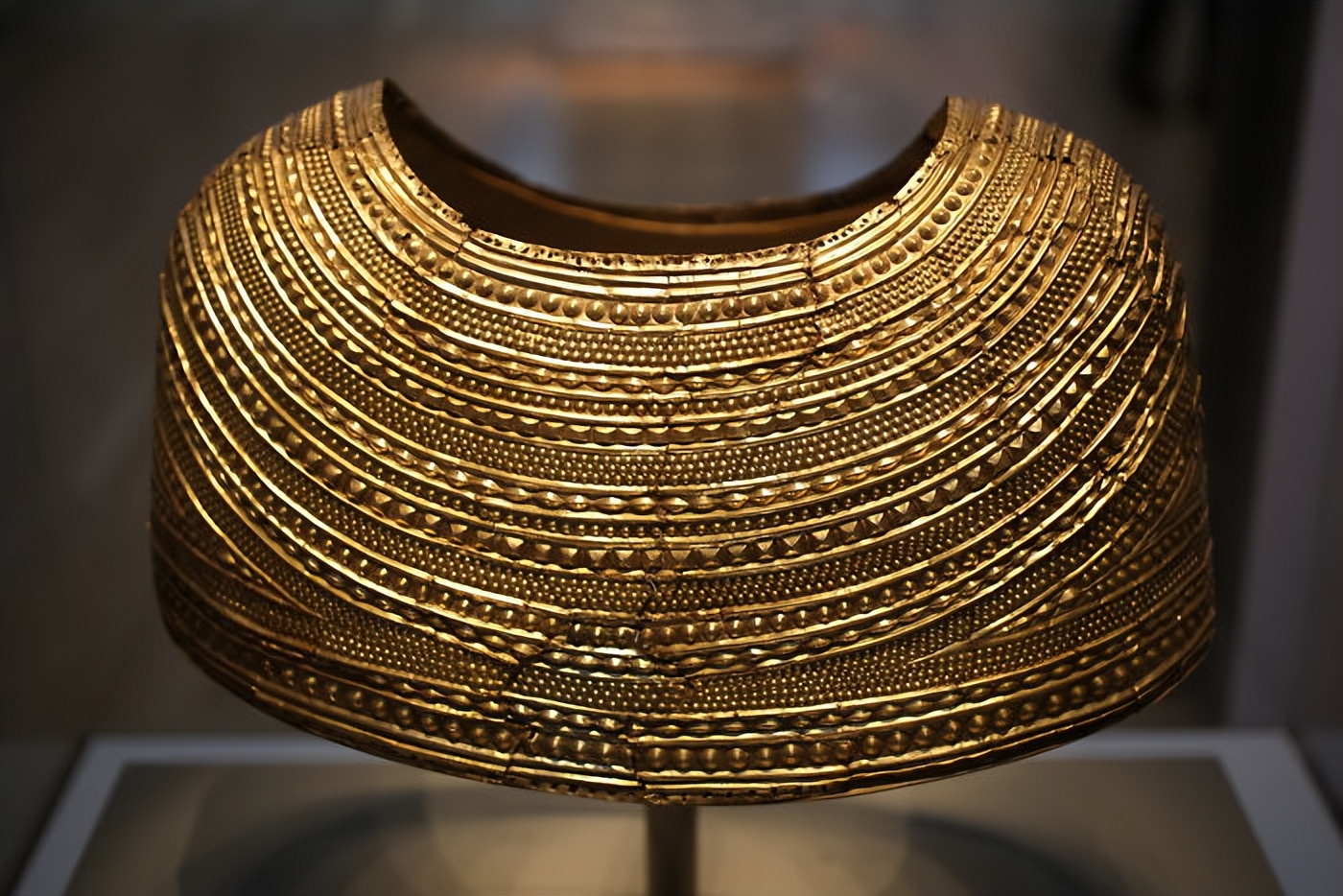 它由一整块金箔捶打而成,佩戴者必定是青铜时代的顶级权贵。如此奢侈的物品,究竟是为生者炫耀,还是为死者陪葬,至今没有定论。