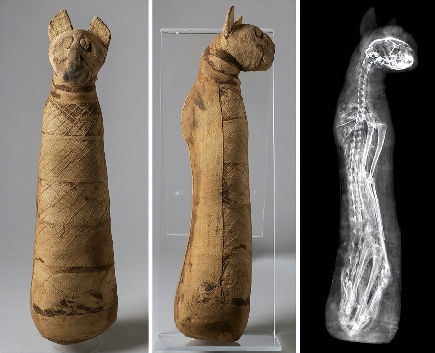左侧是完整的亚麻布猫木乃伊,右侧X光片清晰显示出内部完整的猫咪骨骼。