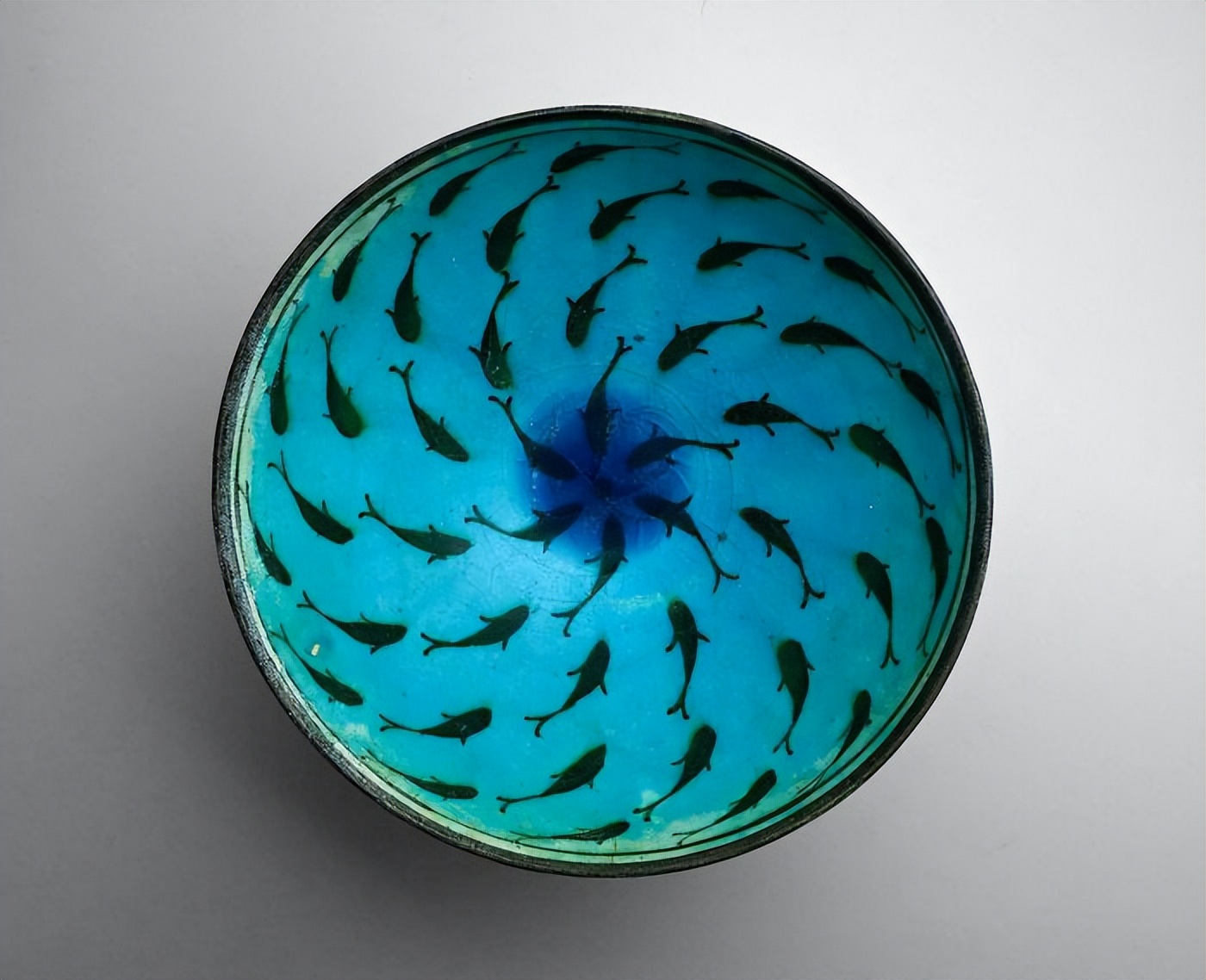 一只陶碗,在青绿色釉下绘有黑色纹饰,图案充满异域风情
