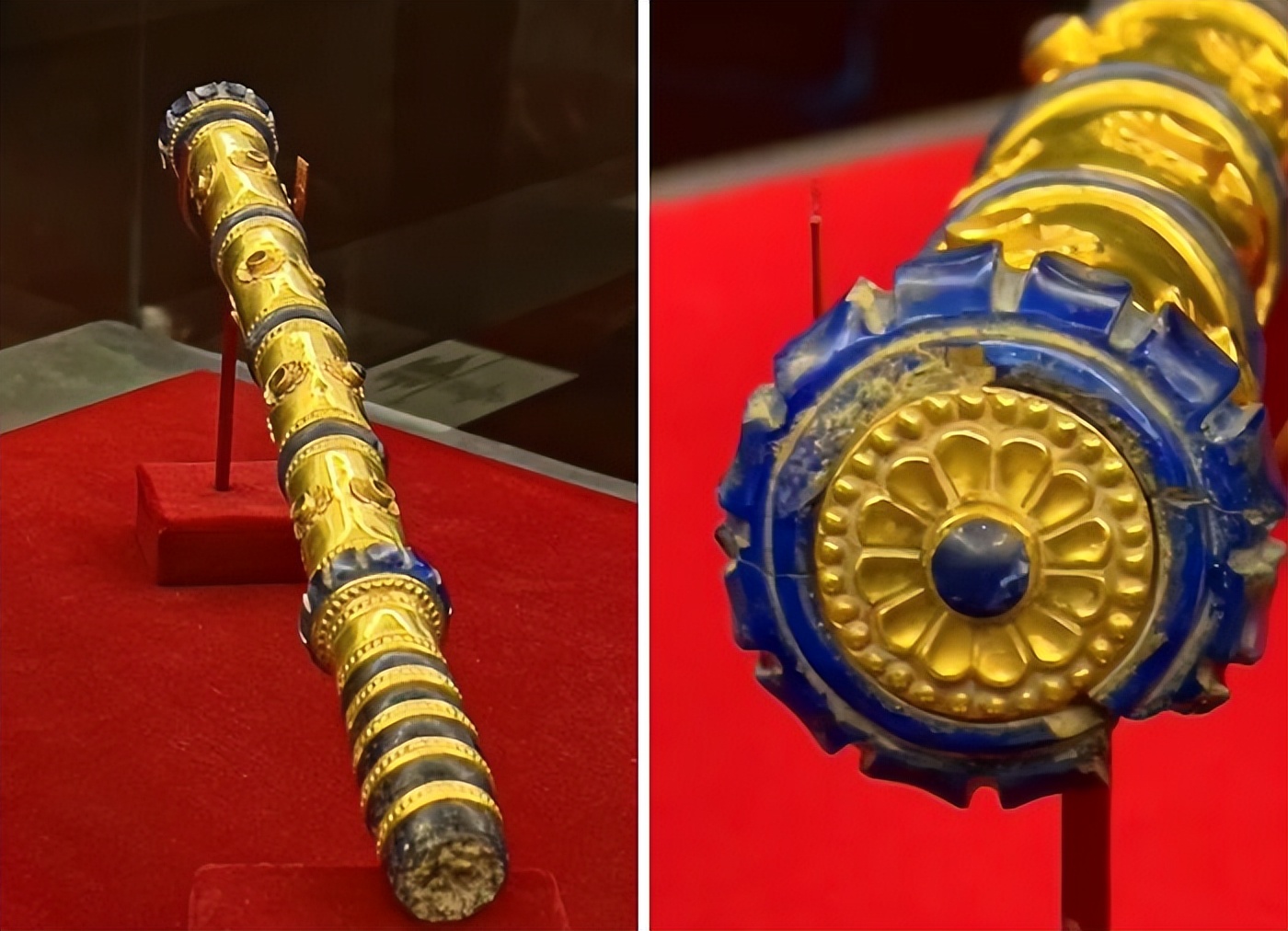 金色的杖身与深蓝色的青金石杖首结合,雕刻着复杂的纹饰