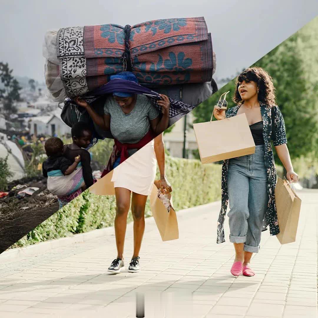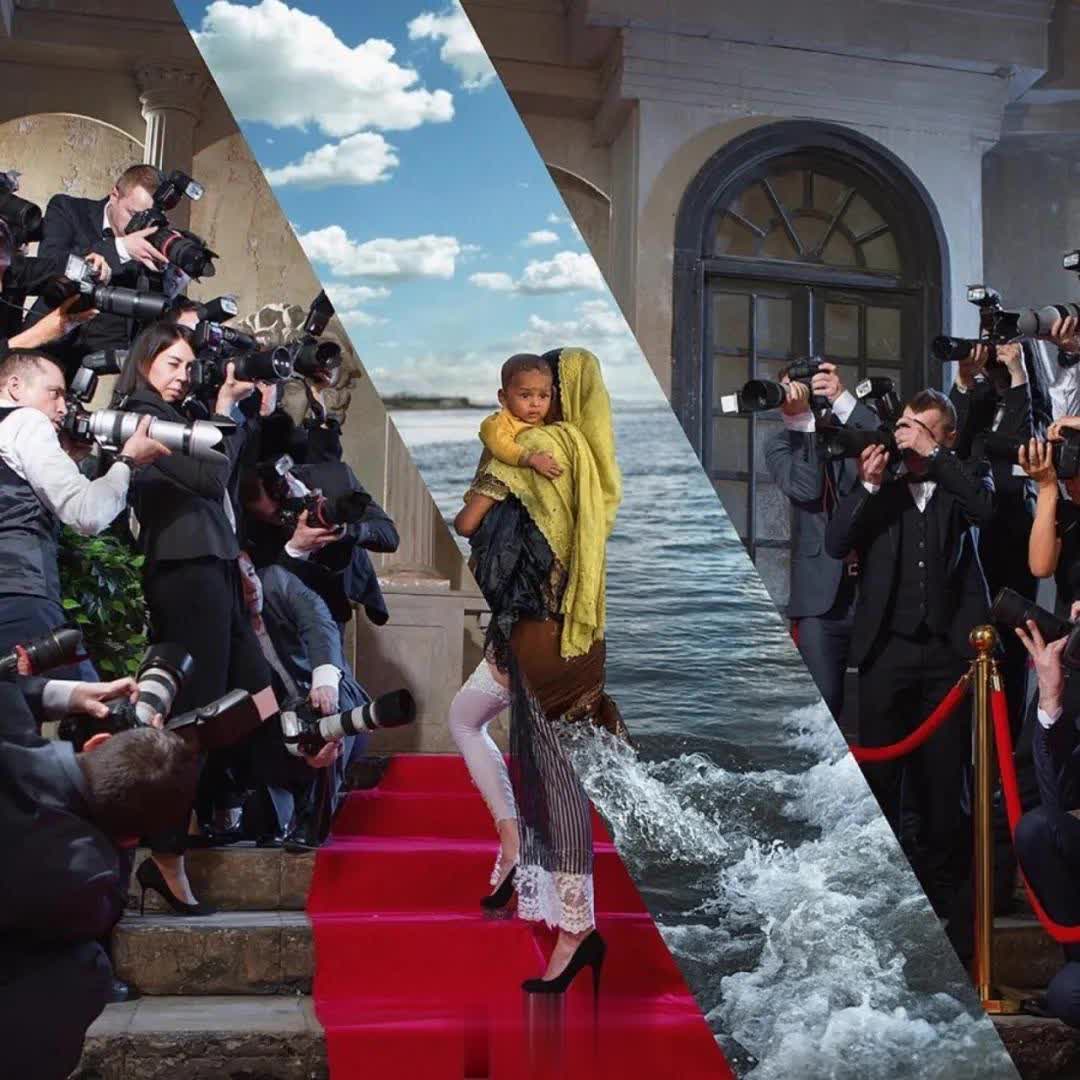构图、光影、甚至人物的姿态,都是相似的。但拼在一起,就像一道劈开世界的闪电——原来同一片天空下,有人在云端喝香槟,有人正从云端坠落。