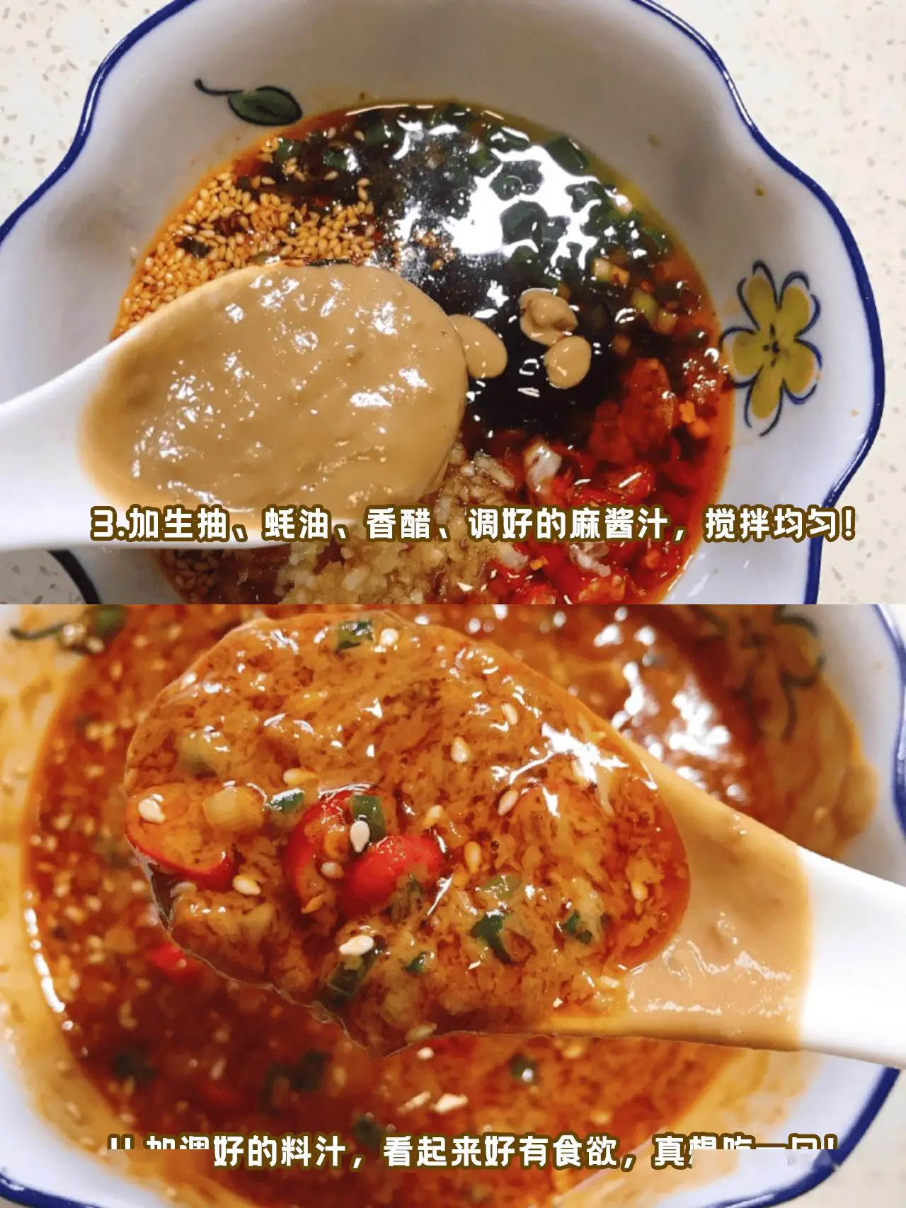 4️⃣芝麻酱用温水卸开,倒入料汁拌匀