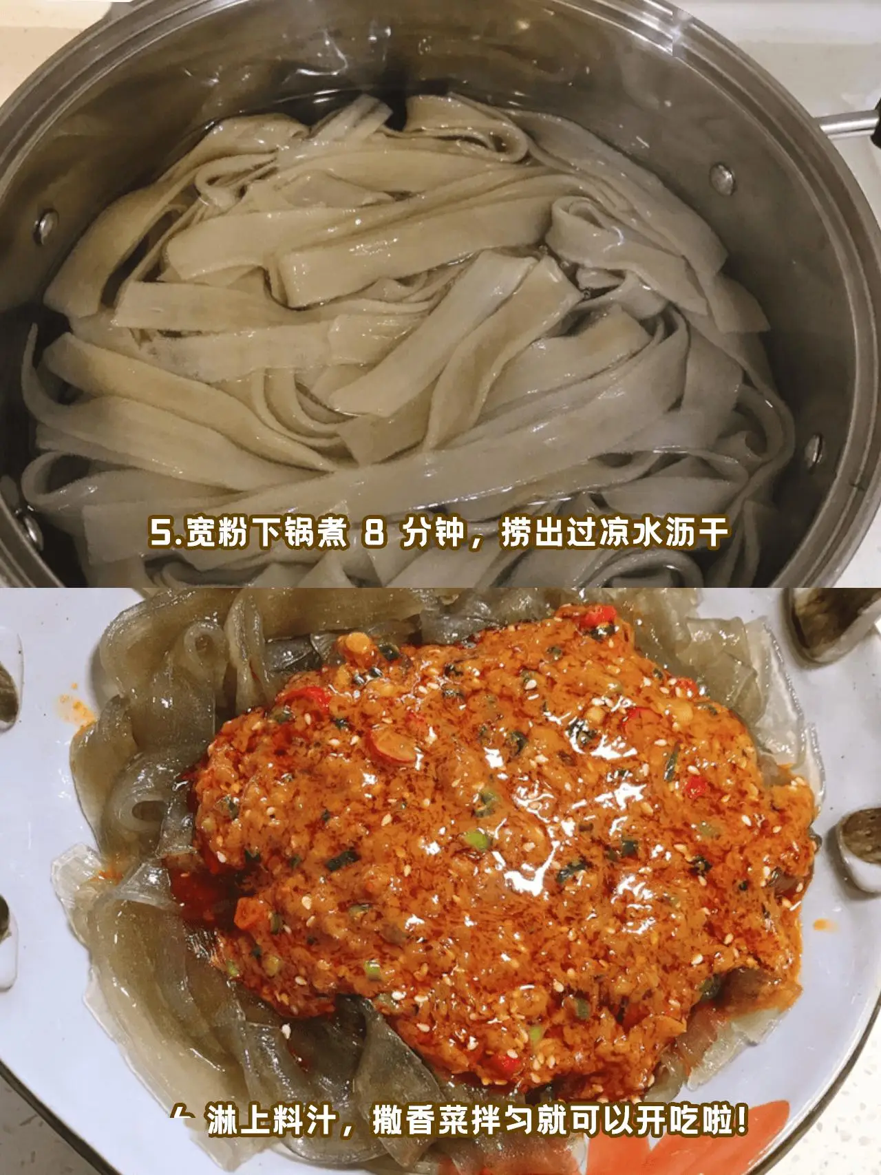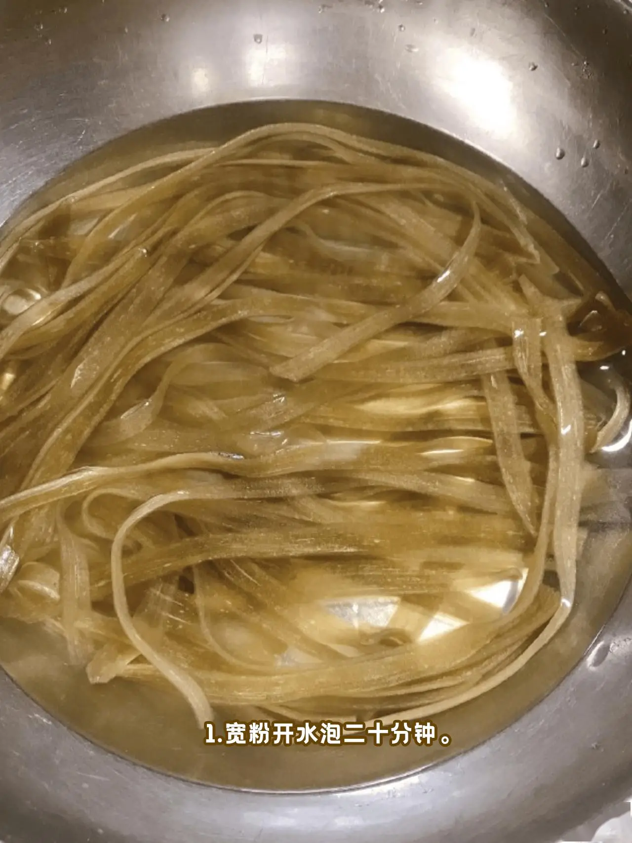 1️⃣宽粉煮熟捞出,过一遍凉水更筋道