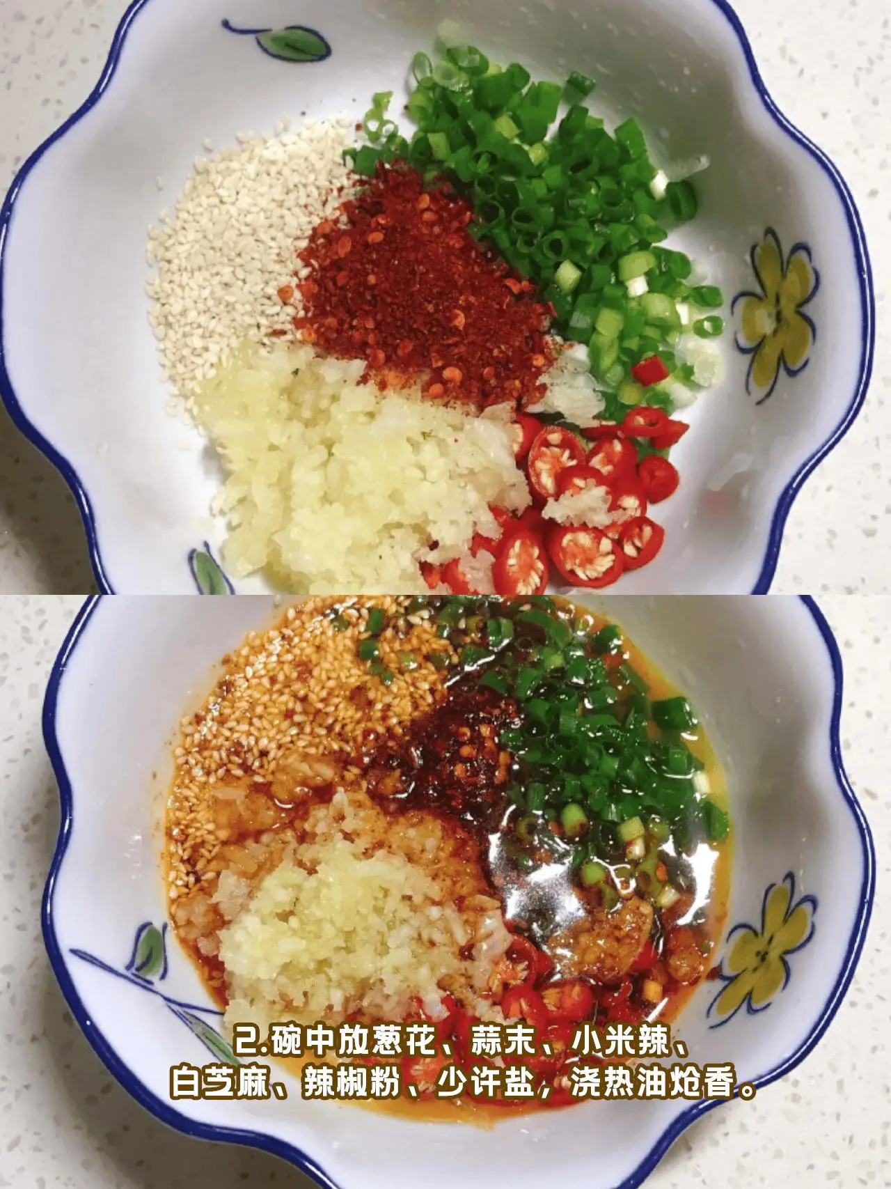 2️⃣碗里放蒜末 + 葱花 + 辣椒粉 + 白芝麻,淋热油激香